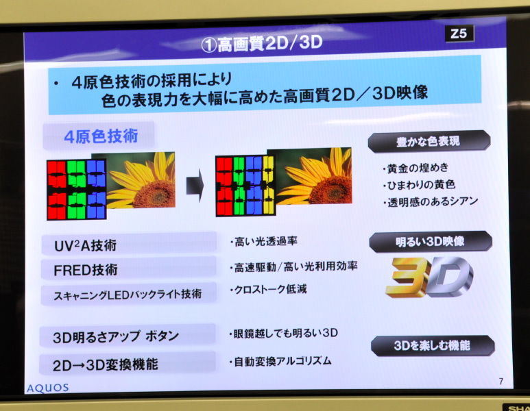 - シャープ、新パネル「ハイスピードUV2A」搭載の“AQUOS クアトロン 3D”「Z5ライン」を発売 2011/01/26