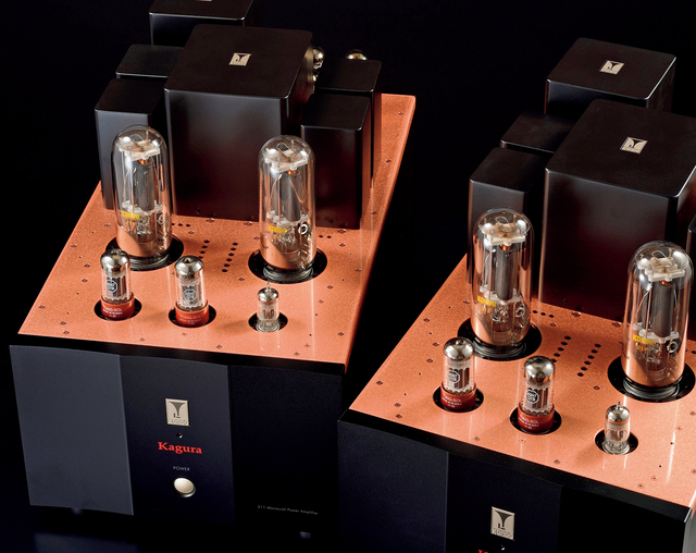 やはり重量級のモノラルパワーアンプ「Kagura」。大型出力管211をパラレルシングルで使用している