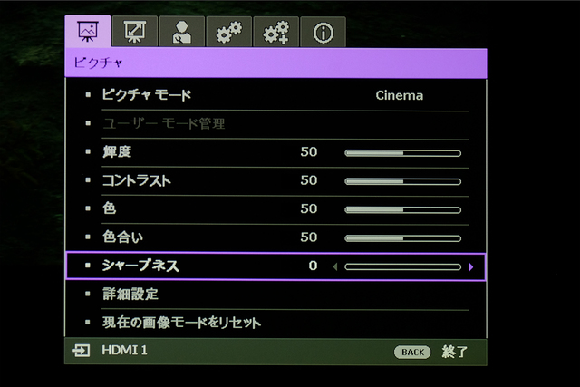 ピクチャーモードを「Cinema」へと変更。シャープネスは「0」も良いが、バランスを取るなら「3」