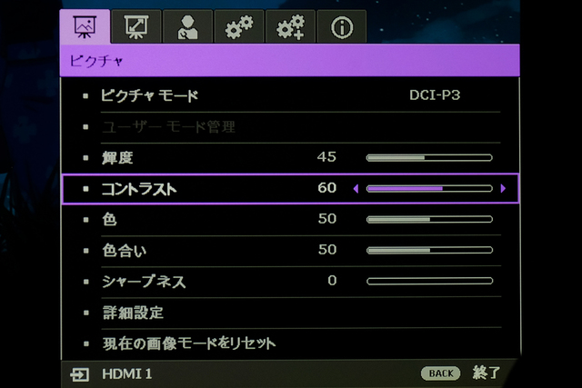 「DCI-P3」とシャープネス「0」にくわえ、輝度は「45」、コントラストは「60」に設定