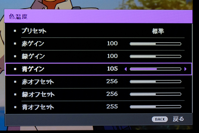 「色温度」メニューで、「青ゲイン」を「105」へと調整