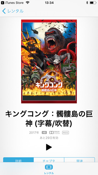 『キングコング:髑髏島の巨神』はドルビービジョン方式のHDRに対応。レンタル作品を端末にダウンロードして「ビデオ」アプリで楽しむこともできた