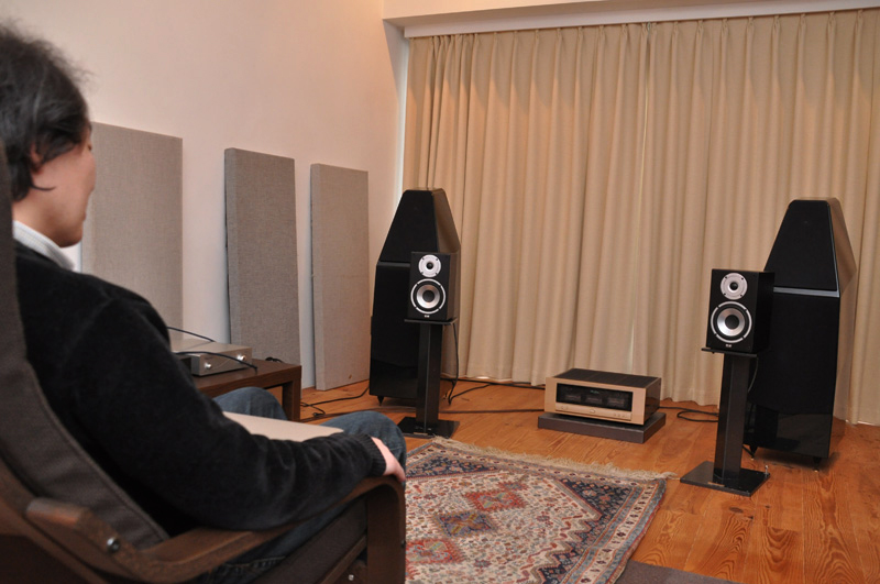 自宅試聴室にて「BS 53.2」のサウンドを聴く山之内氏