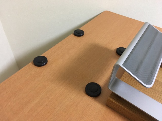 MacBookの土台の奥にインシュレーターを置き……(インシュレーターは圧倒的コスパなオーテクのハネナイト「AT6091」)