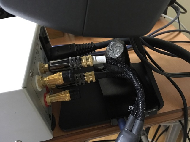 ヘッドホンアンプの後ろも密集地帯。DACがORB特製豪華ケーブルに負けて浮き上がってしまうので重しのフクロウを乗せてある