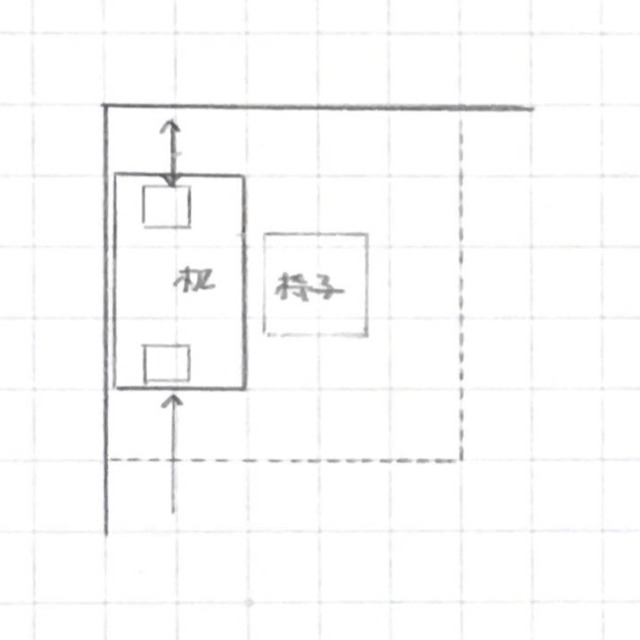 角付近で壁に並行に設置する場合はこんな感じ。点線で示しているのが部屋内でデスク周りに確保したスペースの目安