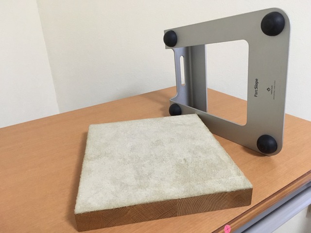 重く頑強なオーク材に皮を接着して滑りとガタ付きを防止。傾斜台も頑強さを重視して選び、底面に制振ゴムを追加して高さとタイピングに対してのブレなさをさらに調整