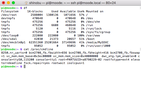 SSHでリモートログインして、マウント中のファイルシステムとシステムブート時のコマンドラインを確認。microSD(/dev/mmcblk0p1)が起動ディスクでないことを読み取れるはずだ