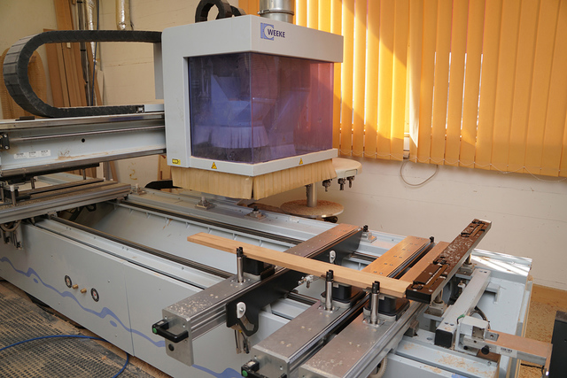木工製作所はウルトラゾーンの本社から車で45分ほどのところにある。巨大な切削機械でアメリカンチェリーウッドの板材からハウジングのパーツを象っていく