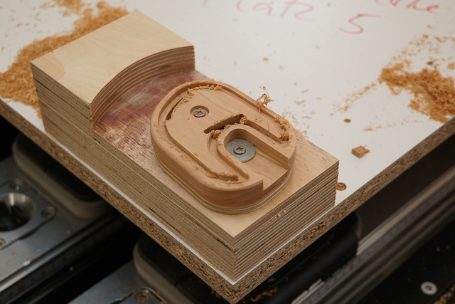 色んな種類のドリルを自動的に付け替えながら、裏側・表側の形を正確に彫っていく。裏表の削り出しが終了。ウッド部は表側が緩やかにカーブしている