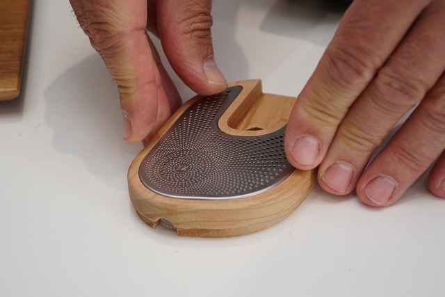 メタルのフェイスプレート。ウッドのパーツにはめ込むとこのような感じになる