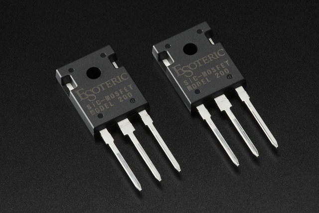 今回新規開発した自社専用素子 「ESOTERIC MODEL200」。最新技術シリコンカーバイドを使ったSiC‐MOSFETで、一般的なものと比較して低容量で低損失を実現する