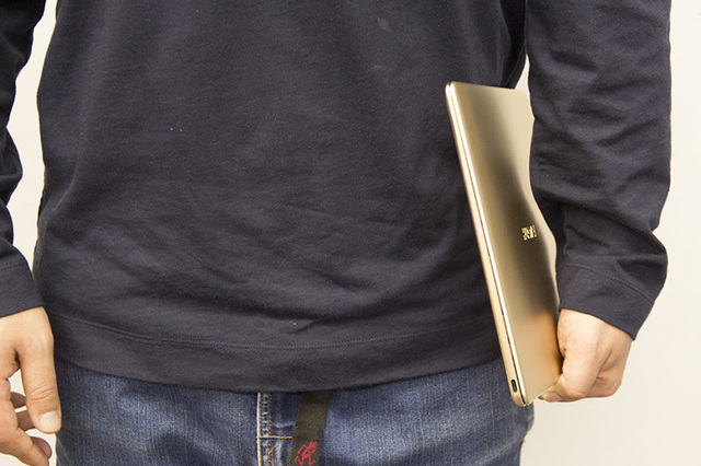 手に持ったところ。A4サイズで約1kgなので持ち歩きは楽々だ