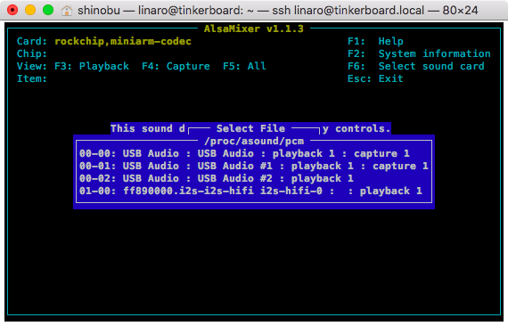 AlsaMixerで確認すると、I2Sで接続された拡張カードはCARD1/デバイス0として認識されていることがわかる