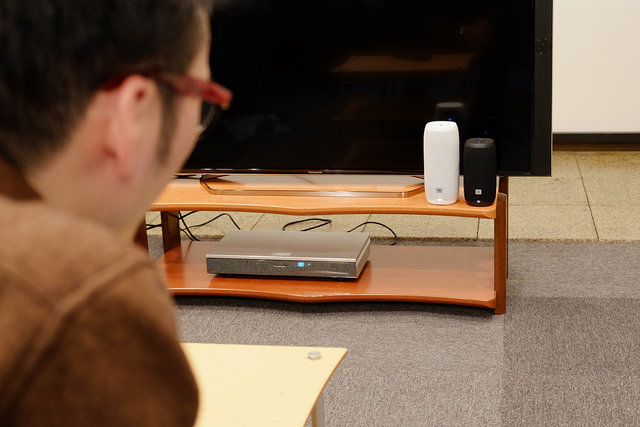 部屋の様々な場所に置いて試聴。広い空間を音楽で満たす十分なパワーがある