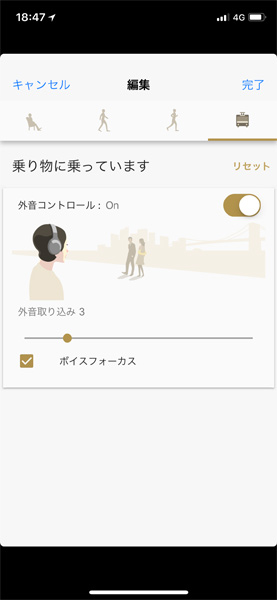 乗り物に乗っている時はノイズキャンセリングをオンに。デフォルトではオフになっているボイスフォーカスをオンにして周囲の声が聴きやすくなるようにカスタマイズも可能