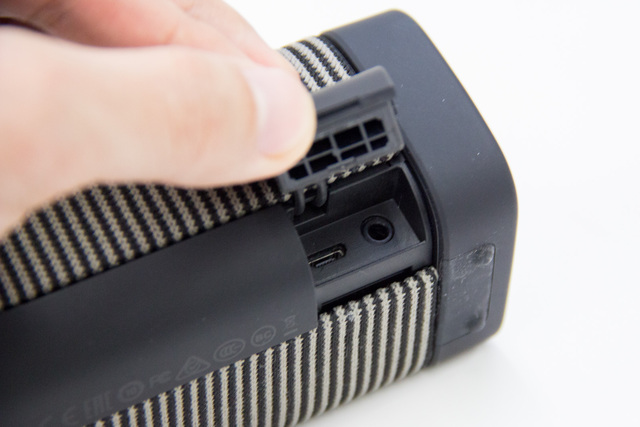 背面のカバー内に充電用端子とステレオミニ入力を搭載