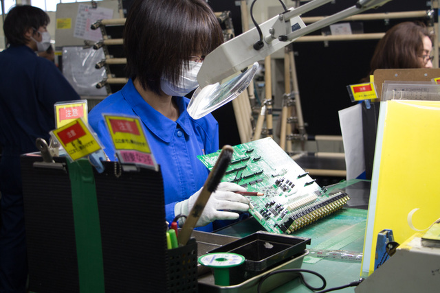 大規模なマシンで製造された基板に、手作業で音質パーツなどを取り付けていく
