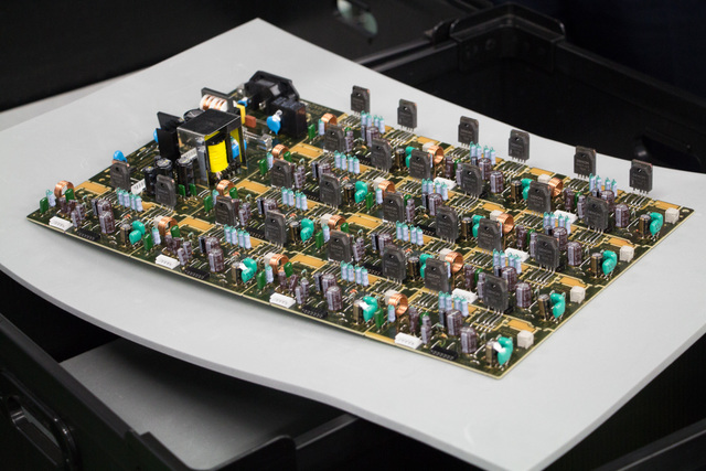 パワーアンプ基板などは効率化のために複数の回路を1枚基板として製造。これを分割して組み上げていく