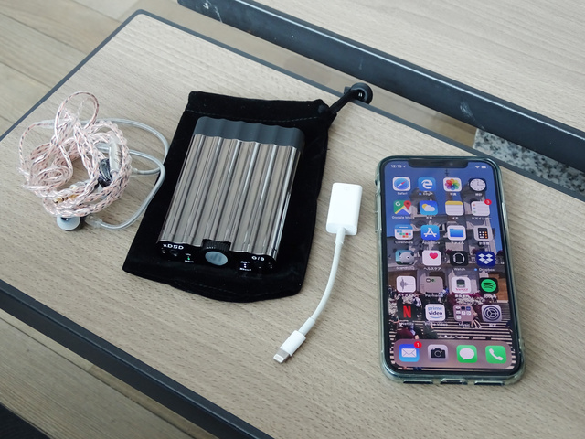 空港のゲートでiPhone Xによる音楽再生を試す。xDSDに同梱されているLightning変換アダプターやポーチ、RHAのイヤホンを用意した