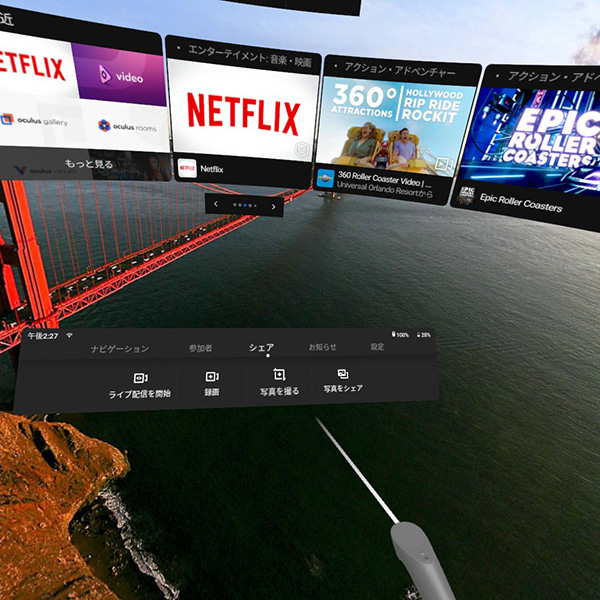 起動すると写真のようなバーチャル空間にコンテンツや設定画面が浮かび上がる