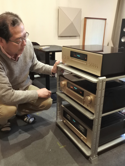 弊社試聴室にてALVENTOオーディオラックの実力を確認する筆者。その加工精度の高さと音質から、期待以上の完成度を確認した