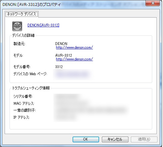 AVR-3312のプロパティを選択。「デバイスのWebページ」に表示されるIPアドレスをクリックすると「Webコントロール機能」がブラウザに表示される