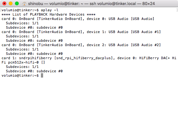 SSHでリモートログインしてオーディオデバイスを確認したところ。「DAC 01」はHiFiBerry DAC+互換カードとして認識されている