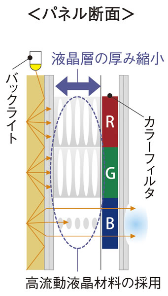<新高速応答IPSαパネル>高流動材料を採用した独自開発のIPSαパネルを採用。液晶パネル駆動が切り替わり、画面上の表示映像が切り替わるまでの時間を従来に比べ半減、残像が少ない映像を実現した