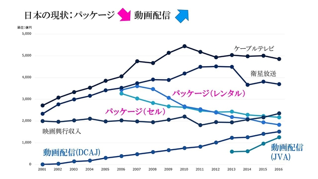 日本の光ディスクメディアによるレンタル/セルはまだ比率が高い。とはいえ、動画配信の利用率は増加している。(出典:映像メディア総合研究所)