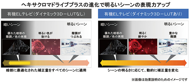 業務用マスターモニターにも採用されている3次元カラーマネジメント回路(3D-LUT)がさらに進化。暗部の補正点数を従来モデルの約1.6倍ほど増強した。また、3D-LUTの補正量を画面の明るさに合わせ動的に補正量を制御している。これによって暗部も明部も、シーンに応じて、より正確な色再現ができるようになった