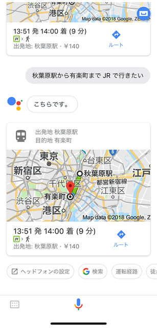 普段から通い慣れているが、一応秋葉原から有楽町まで電車で移動する方法を調べてみる。「JRで」と指定しないと東京メトロ・銀座線をレコメンしてくる