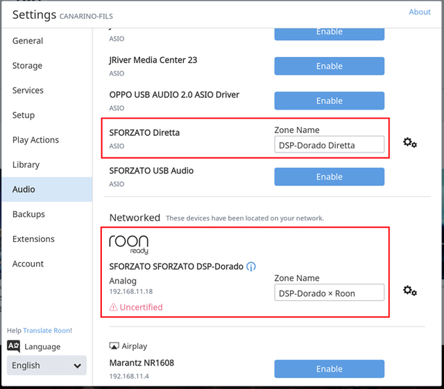 Roonの設定画面。上の赤枠ではDSP-Dradoは「DirettaによるLAN DAC」として認識、下の赤枠では「Roon Ready」として認識されている