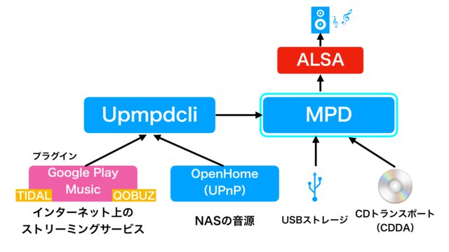 「1bc」の再生経路概念図。すべての音源/再生サービスがMPD経由でALSAへ伝わる