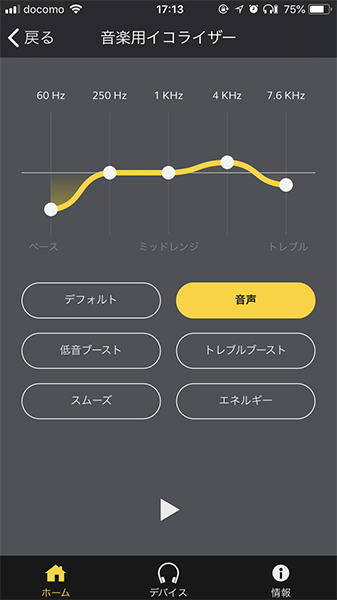 5バンドのイコライザー設定で、好みの音質にチューニング可能。登録しておけばいつでも再設定して使うことができる