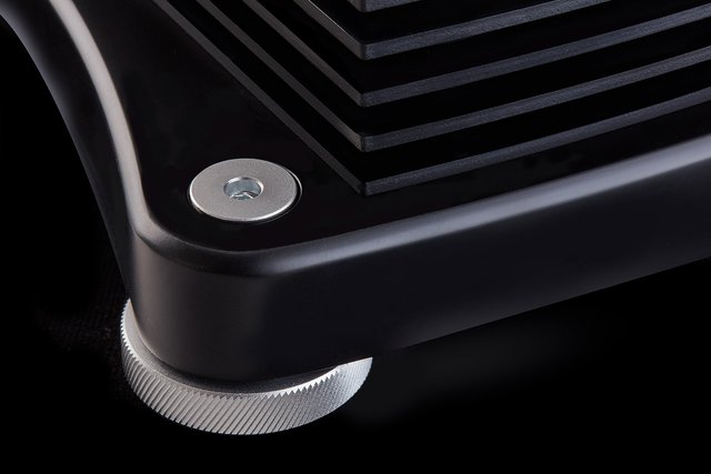 F501のベース部。リジットMDFのボトムにアルミスパイクを採用。バランス調整が容易にできるようになっている