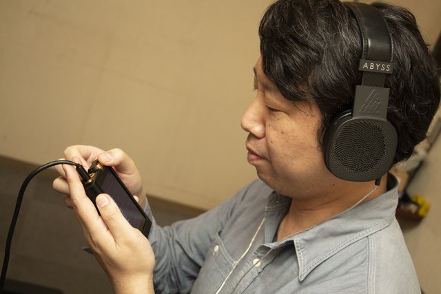 試聴中の岩井氏。写真のABYSS「DIANA」をはじめとしたヘッドフォンの組み合わせは次回のレポートで掲載予定