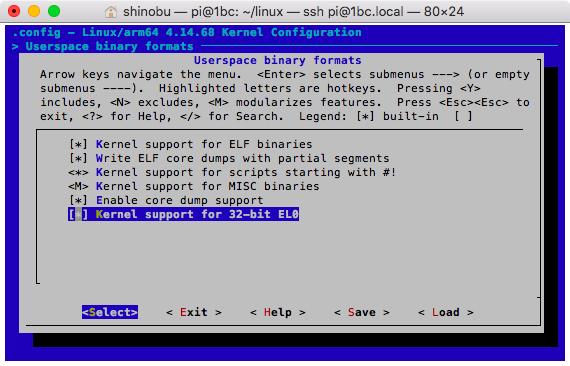 「Kernel Support for 32-bit EL0」を有効にしてカーネルの再構築を行う