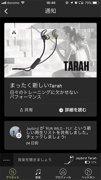 Jaybirdからのお知らせやアップデート情報なども通知される