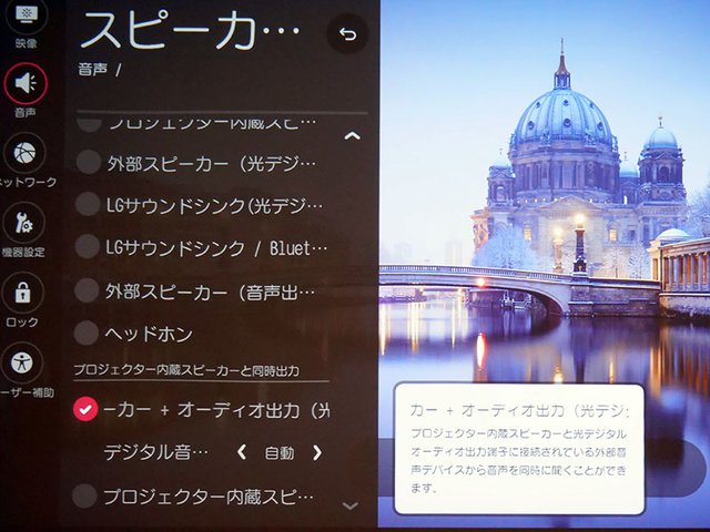 HOME > レビュー > レビュー記事一覧 縦型設置など使い方自由自在 4Kの超大画面が自由自在! LG「HU80KS」は単なるプロジェクターじゃない、新ジャンル家電だ 鴻池賢三 2018年11月24日 前の写真へ 次の写真へ 本体のスピーカー出力と外部オーディオ出力を同時に行うこともできる 前の写真へ 次の写真へ この写真の記事へ 関連リンク LG「HU80KS」製品情報 LGエレクトロニクス・ジャパン