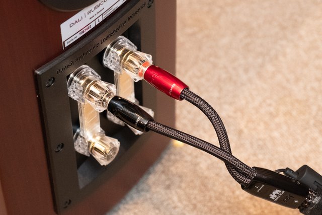 通常の接続。高域用と低域用の端子はジャンパー線で接続されている