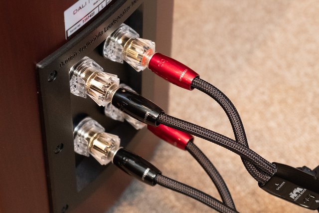 バイアンプ接続。ジャンパー線を取り除き、それぞれの端子にケーブルを接続する