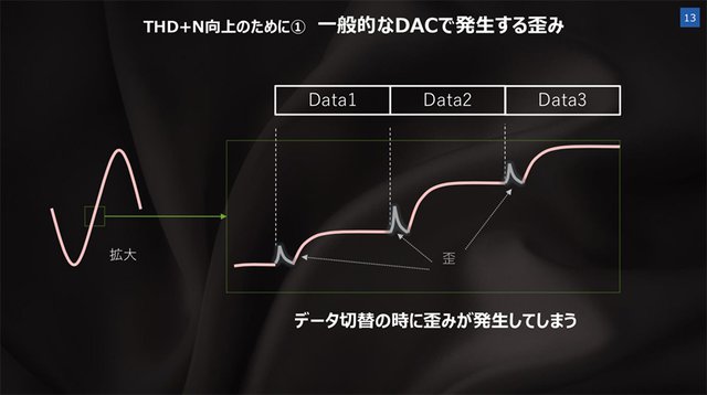 一般的なDACでは、データ切換の際に歪みが発生する