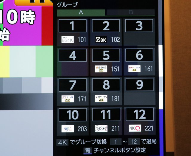 4K放送はA、Bそれぞれのグループに、リモコンの数字ボタンを押したときのチャンネルを割り当てられる