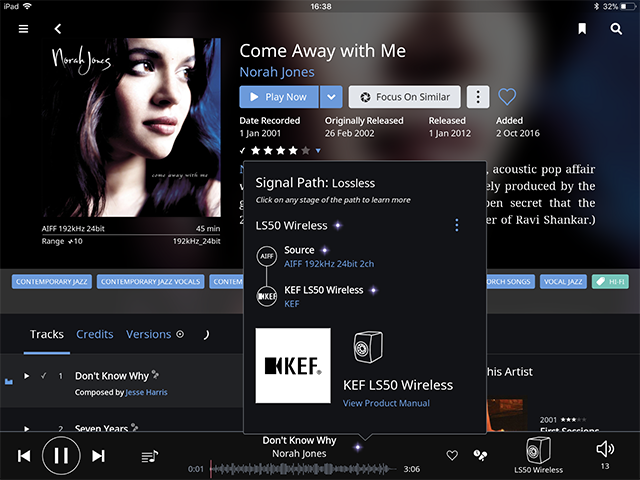 こちらはRoonの画面。再生先にLS50 Wirelessを選択したところ