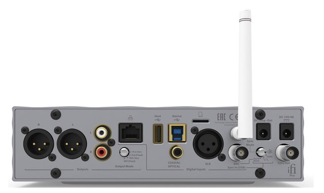 Pro iDSDの豊富な機能を裏づけるのが、入出力端子の多様さ。デジタル入力はUSB 3.0(Bタイプ)やRCA同軸/丸型光TOSコンボ端子、XLR端子によるAES/EBU、クロック入力端子にも使用できるBNC同軸などを装備。外づけHDDを接続するAタイプのUSB、そしてネットワーク再生を可能とするETHERNETや、microSDスロットなども搭載する。RCA/XLRアナログ出力には出力レベルの可変/固定 設定を行えるので、DACプリとしても使用することが可能だ