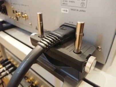 機器の電源インレット端子へ挿す電源ケーブル部を「NCF Booster-Signal」で支えた例。端子の位置によっては「NCF Booster」を使う必要のある機器もある