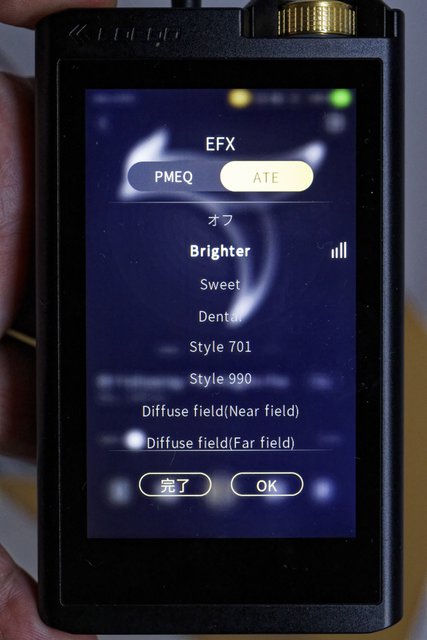 再生画面の右下をタップすると現れるATEとPMEQの設定画面。こうしたよく使う機能には簡単にアクセスできるデザインとなっている