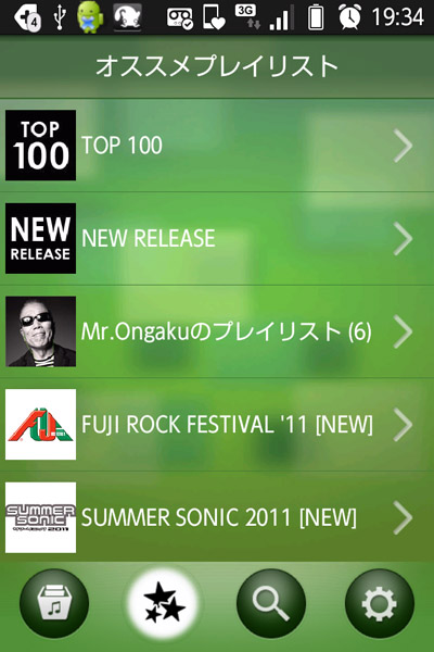 オススメプレイリスト。「TOP100」や著名人によるプレイリストなど様々なテーマのものが用意されている