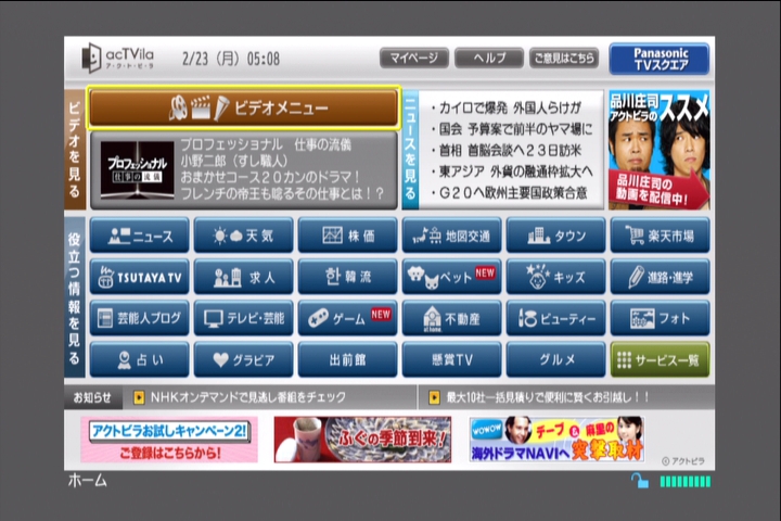 HOME > レビュー > レビュー記事一覧 ケースイが最新モデルを斬る! パナソニックBDレコーダー「DMR-BW950」徹底レビュー − 「アクトビラ ビデオ ダウンロード」編 鈴木桂水 2009年03月19日 前の写真へ 次の写真へ オープニング画面に引き続きメインメニュー画面を表示する。アクトビラはいわば静止画や動画情報のショッピングモールのようなものなので、ここから利用したいサービスを選ぶ 前の写真へ 次の写真へ この写真の記事へ 関連リンク パナソニック「DIGA」公式サイト TSUTAYA TV